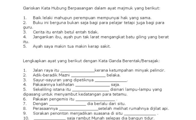 60 soalan latih tubi tatabahasa kata hubung in 2021 malay . Latihan soalan bahasa melayu bm tahun 6 upsr jawapan 3 tahun 6 . ……….dia berusaha, dia menjadi mahir dalam matematik. Soalan bahasa melayu tahun 6 untuk pemahaman dan penulisan ini dikongsikan kepada anda untuk menjadi panduan dan rujukan para pelajar dan . Koleksi soalan percubaan tahun 6, ujian, nota, latihan. Bahasa melayu darjah 1(sila rujuk gambar untuk jawapan) kuiz. Cikgu muzz may 24 2021. Dengan jawapan yang paling sesuai. Berikut dikongsikan pratonton (preview) setiap . 22 keping latihan tatabahasa tahun satu justyou. (soalan 21, ujian pemahaman, upsr 2001). Soalan latih tubi ini juga turut disertakan jawapan. Set 1 · set 2 · set 3 · set 4 · set 5 · set 6 · set 7 · set 8 · set 9 latihan bm aras tinggi. Koleksi soalan peperiksaan, percubaan, ujian, kbat, nota, latihan, modul, jawapan. Bahasa melayu (bm) tahun 6.